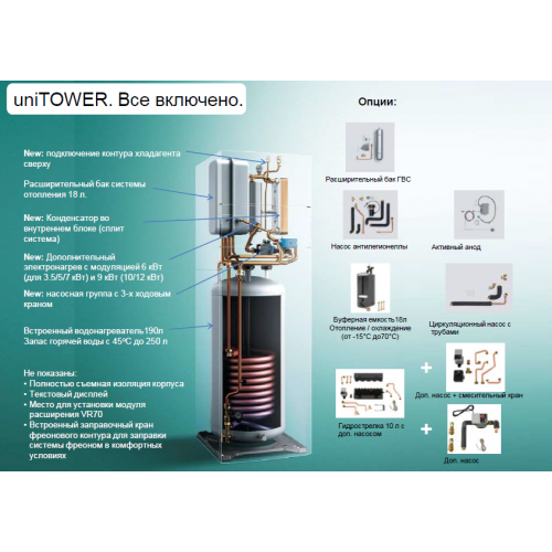 Одним из наиболее прагматичных решений, при выборе теплового насоса воздух-вода от компании Vaillant в качестве основного источника тепла, является комплектация не с обычной гидравлической станцией (сплит-системой), а с встроенным водонагревателем uniTower.