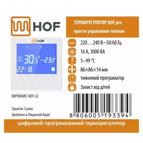 Программируемый терморегулятор Хоф Про (hof pro) — является удобным и легко-управляемым регулятором, что обеспечивается крупным ЖК-экраном с голубой подсветкой. Данные отображаются корректно и четко.