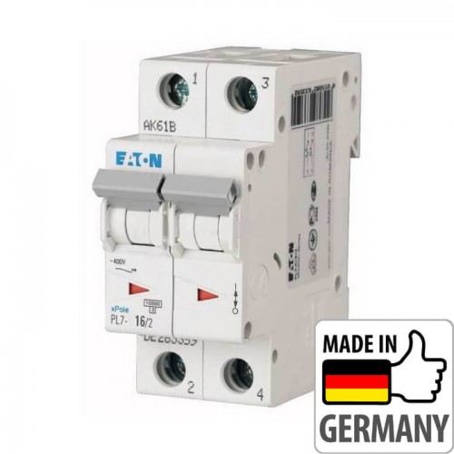 Автоматичний вимикач EATON серії PL7 призначений для захисту електричних ланцюгів від струмів короткого замикання та перенавантаження. Легко монтується на DIN-рейку, прямокутний індикатор положення контактів (увімкнено / вимкнено), можливість підключення додаткових пристроїв. Індикації номінального струму автоматичного вимикача - кольором керуючого важеля (у кложного намінала свій окремий колір). Автоматичні вимикачі серії PL7 дозволяють підводити живлення як зверху так і знизу.