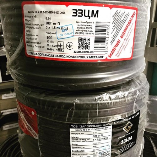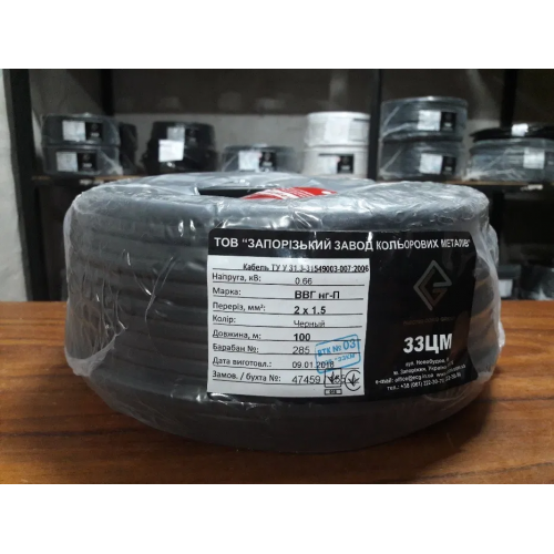 ВВГнг 2х1.5 - силовий кабель з мідними жилами в ПВХ ізоляції, з оболонкою з ПВХ пластикату має захист від ультрафіолету, не підтримує горіння. Струмопровідна мідна жила -однопроволочная кругла. Виробництво Запорізький завод кольорових металів (ЗЗЦМ).