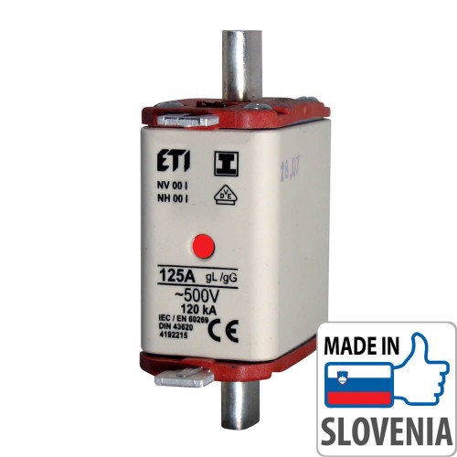 Наш интернет-магазин электротехники предлагает Вам купить ножевой предохранитель NH00 KOMBI на 125А с характеристикой срабатывания gL/gG для защиты линейных цепей от короткого замыкания и перегрузки производства Словенского электротехнического концерна «ETI» со склада в Харькове.